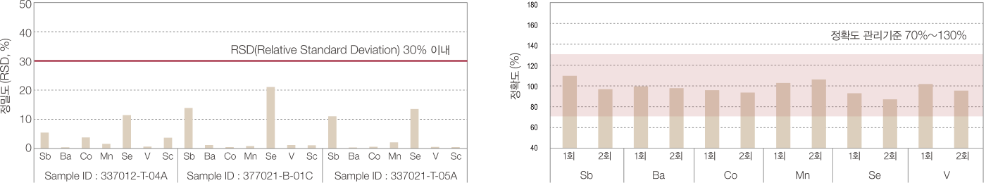 - 토양: 무기물질 31개항목, 유기물질 70개 항목(VOC, PAH, GRO/DRO), 일반물질 5개 항목